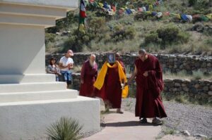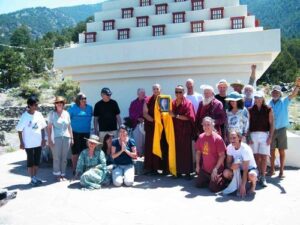 On Sunday, June 23, about 25 people gathered at the stupa to recite offering prayers and good wishes for His Holiness’s long life. (Photo courtesy Daniel Brooks). Smoke from nearby wildfires fills the valley behind the chanters. Circumambulating the stupa with the photo of His Holiness. A delicious birthday cake was offered.