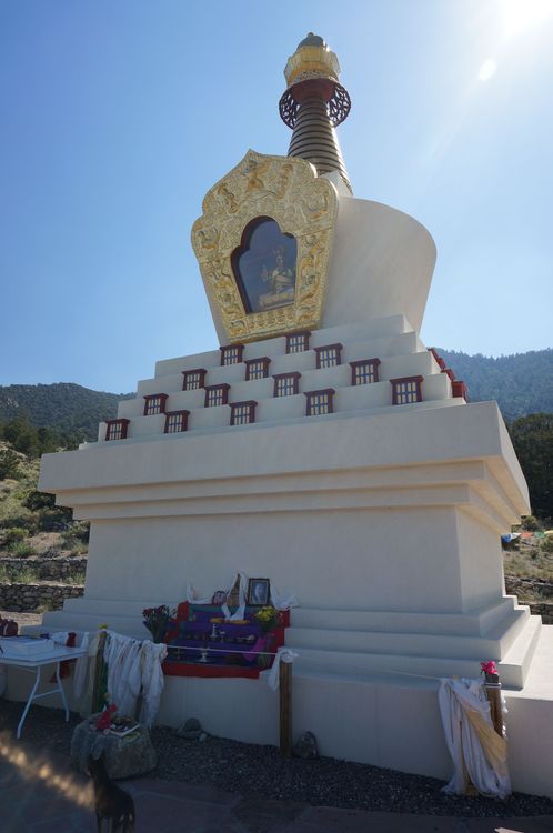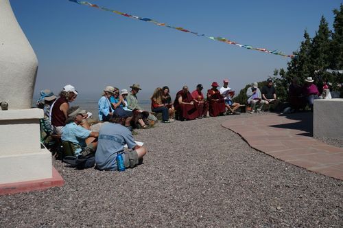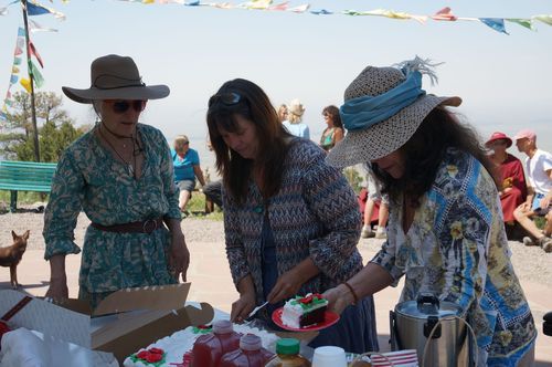On Sunday, June 23, about 25 people gathered at the stupa to recite offering prayers and good wishes for His Holiness’s long life. (Photo courtesy Daniel Brooks). Smoke from nearby wildfires fills the valley behind the chanters. Circumambulating the stupa with the photo of His Holiness. A delicious birthday cake was offered.