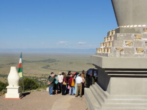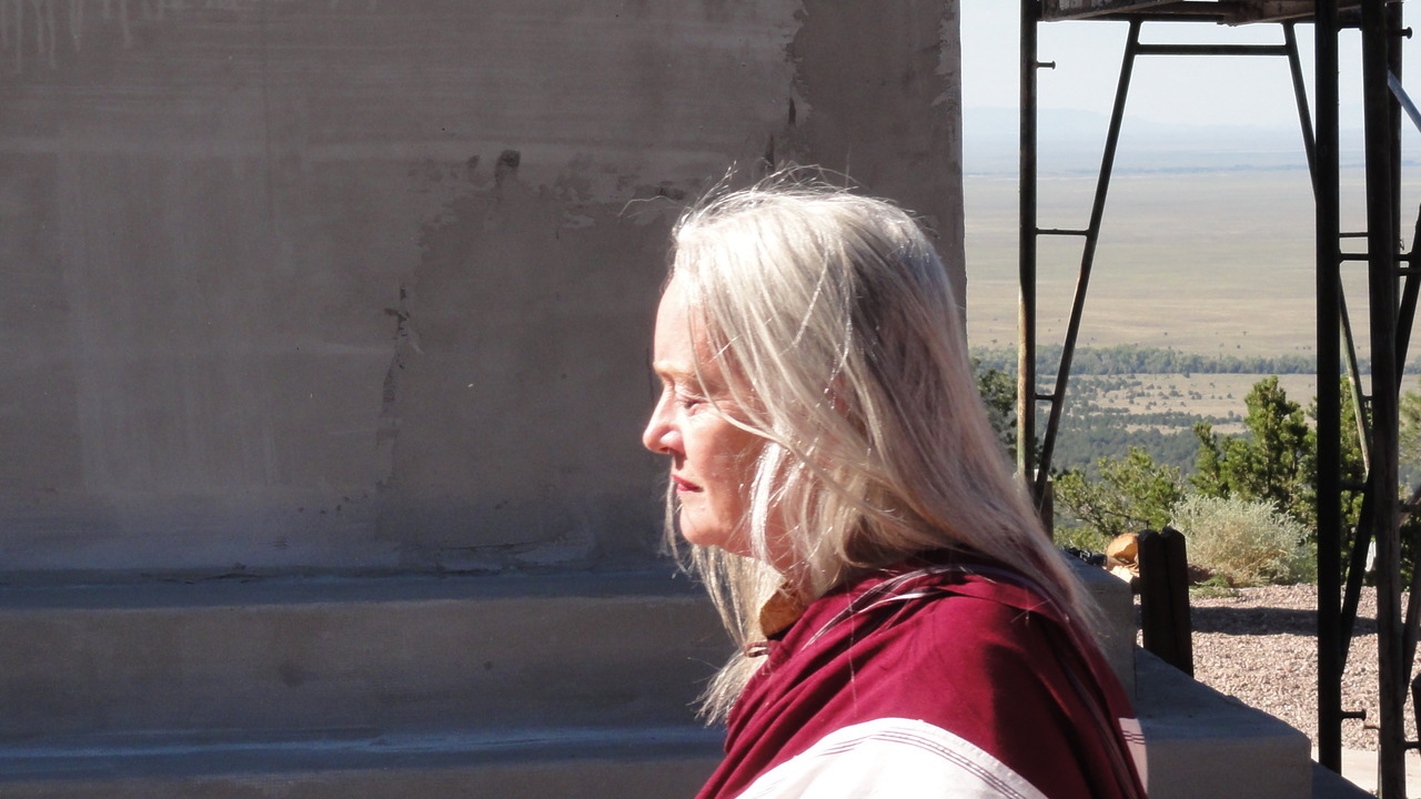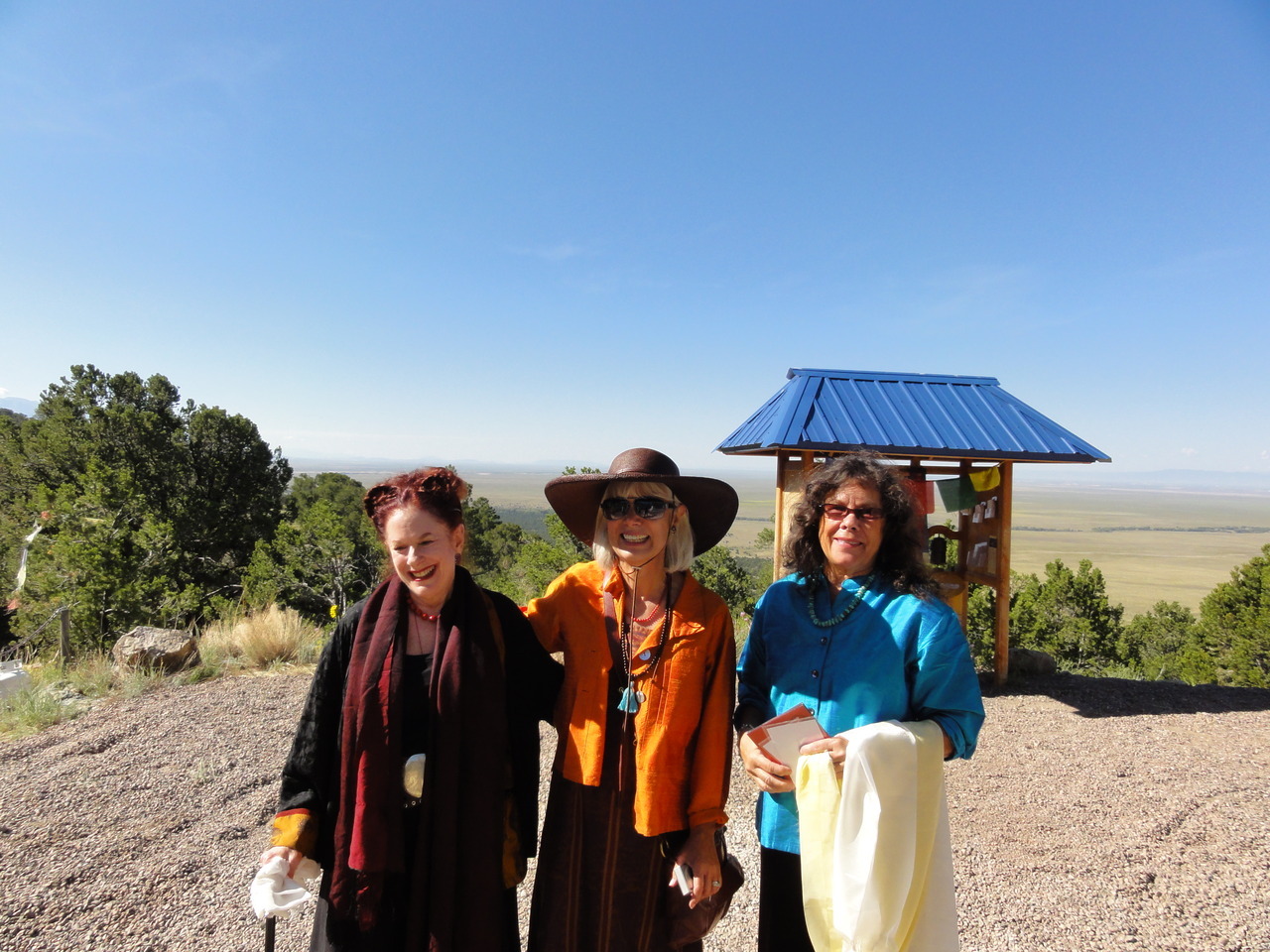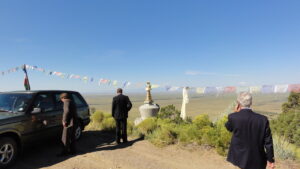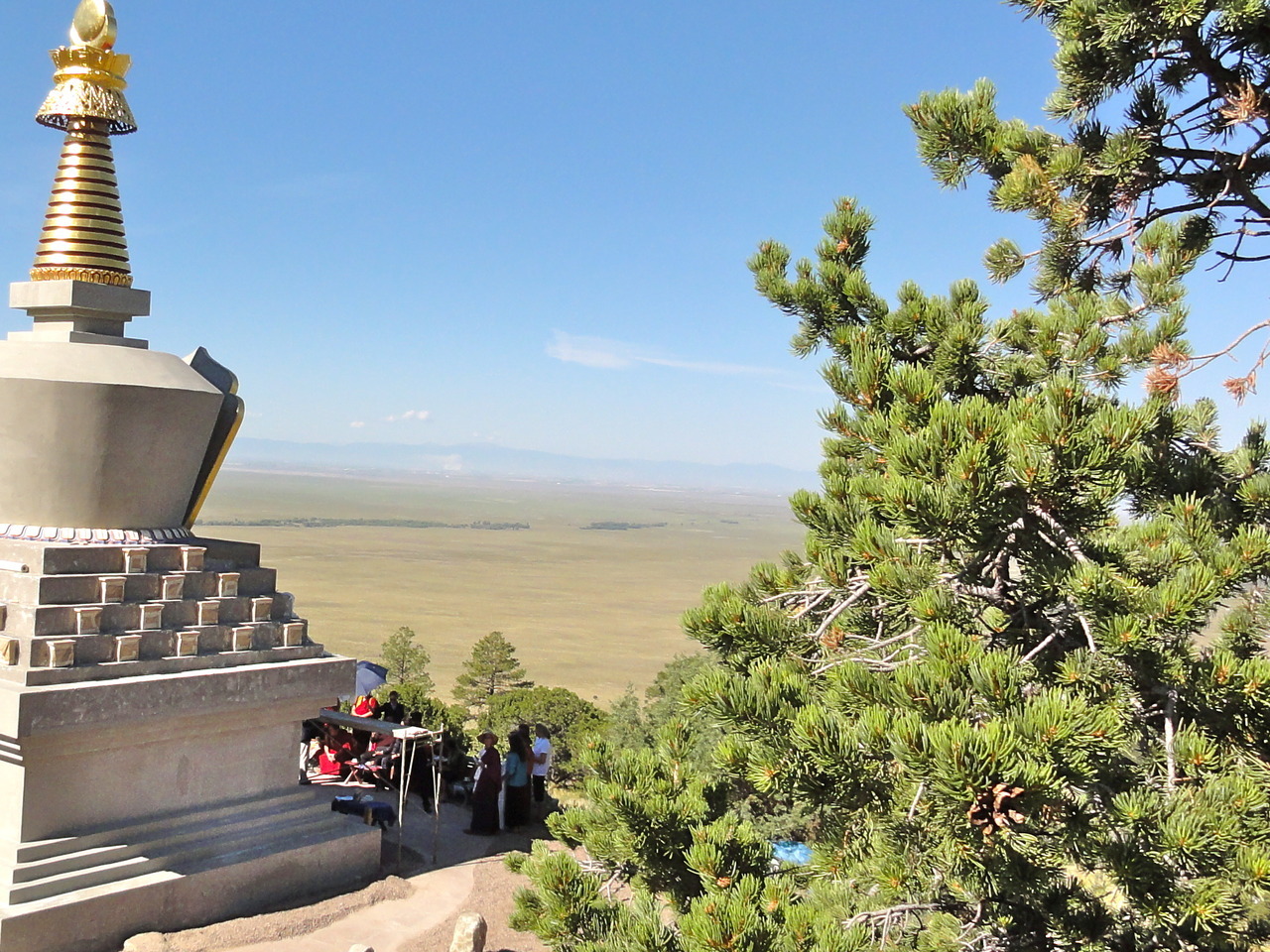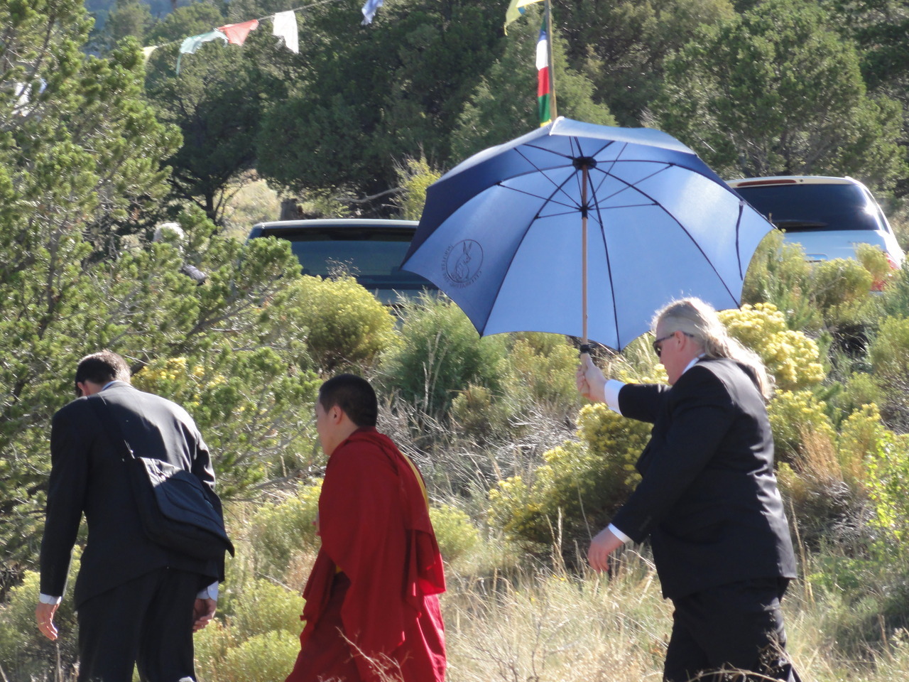 As part of his North American Tour, Khyentse Yangsi Rinpoche blessed the Tashi Gomang Stupa today. The stucco workers took a break and watched in the parking lot as Rinpoche’s entourage of 6 or 7 cars and a number of other participants came up the road and circumambulated the stupa.