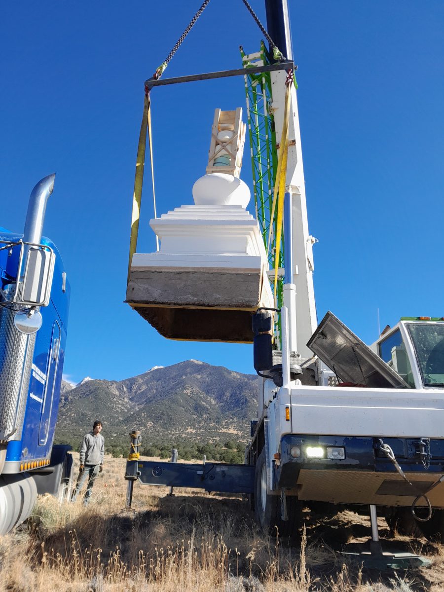 Restoration and improvements for the stupa commenced again in late spring. To begin with, polished granite slabs, procured and fabricated in Albuquerque, NM, were placed as a capstone on the concrete base, creating an elegant platform for offerings. Then, after some repair, the stupa received a new white stucco coat. As you can see in the photos below, the completion of this work magnifies its beauty and presence on the new site. It “stands out like a beacon,” as one recent visitor stated.