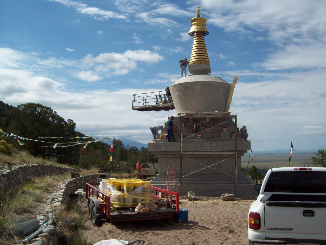 The sandblasters bring in a machine that will allow Ron to work up high enough to aim the pressurized sand downwards from the top and so keep the gold bhumi rings protected. Towards the end of Friday, he finishes as much as he can do with the hose. The protective black plastic comes off, the bedspread falls down to the ground. One more day of hand work and then the sandblasters will take their equipment away. Already the next crew, the stucco workers from Taos have arrived. Throughout the work, people continue to pray at the Stupa.