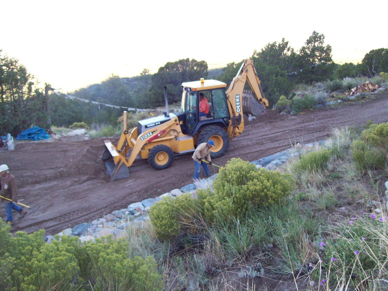 arrived early Monday morning, 8 of them. They immediately jumped all over the Stupa and began work. Meanwhile the sandblasters finished up their work. Ron, had an accident that later required 9 stitches. The sandblasting crew took lots of the accumulated sand off of the driveways and put two truck loads of gravel around the stupa and in the driveway. The stucco workers began work at the top– fearlessly, sometimes almost dangling.